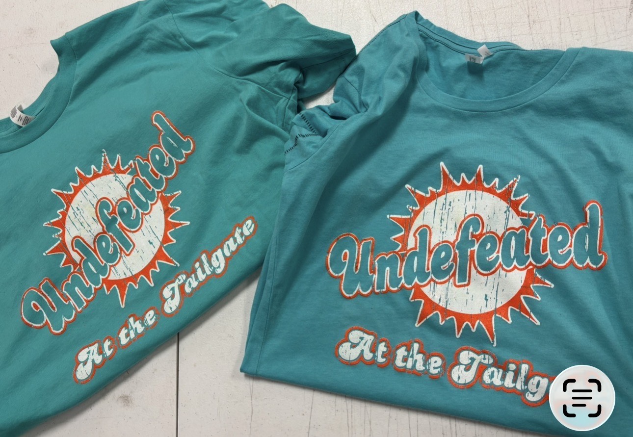 Aqua shirts with orange and white print...if we do anything right, its tail gating!